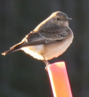 Jag åkte tillbaks till stenskvättan. Nu var Inger-Marie och Robert på plats. Vi letade runt Trugsbo-Kalles gård eftersom den försvann för oss bakom ett buskage på gården innan vi lämnade den. Vi hittade inte fågeln. Då kom Gudrun körande från Djupebo och berättade att hon sett en fågel med vit övergump flyga över vägen vid Nybrobäcken. Nu riktade vi sökinsatsen mot det hållet. Snabbt hittades stenskvättan sittande på en stör bredvid min bil - Tack för den!